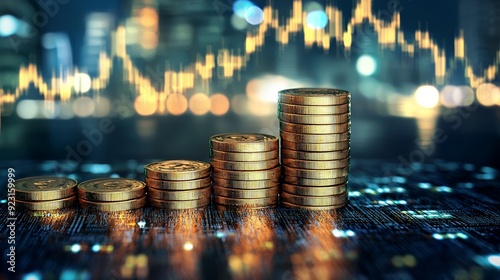 Stacks of coins with rising financial graphs, symbolizing investment growth and economic success in the modern financial market.