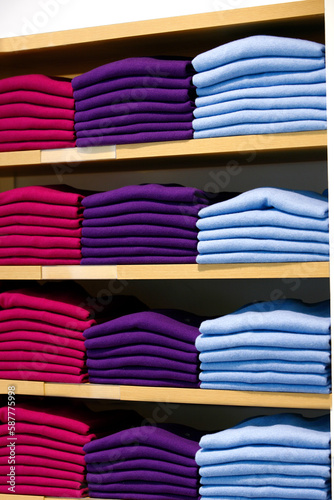 Stacks of colorful cashmere sweaters on shelves in retail store.
