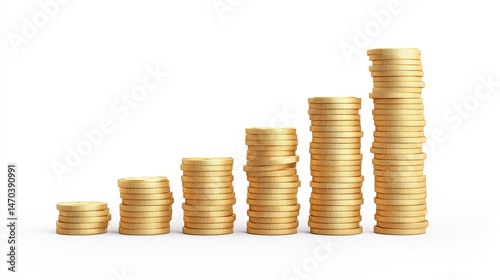 Stacks of gold coins arranged in ascending order, symbolizing financial growth and increasing wealth on a white background.