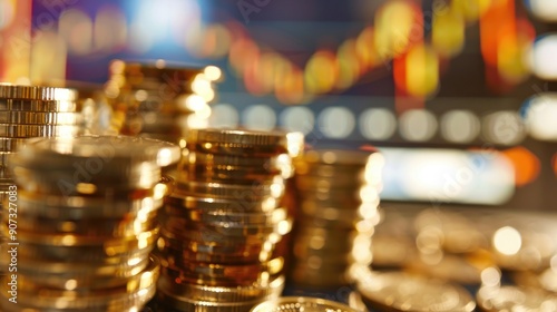 Stacks of gold coins placed on top of financial charts and graphs, symbolizing wealth, investment, and financial growth..