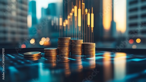 Stacks of gold coins rising, financial chart overlayed on city backdrop