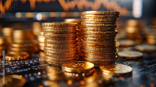 Stacks of gold coins with a rising stock chart in the background, symbolizing wealth, investment, and financial growth