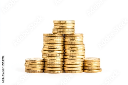 Stacks of golden coins arranged in a pyramid shape, symbolizing wealth and financial growth.