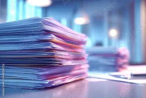 Stacks of Organized Papers with Soft Glow in Office Environment Creating a Modern Administrative Atmosphere