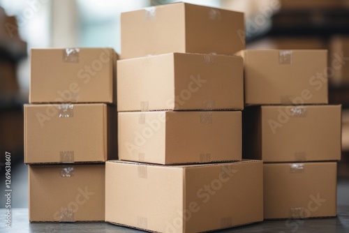 Stacks of sealed cardboard boxes sit in a warehouse, representing shipping, delivery, and online retail