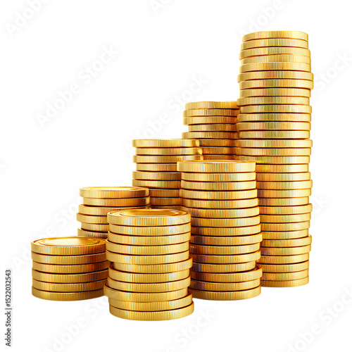 Stacks of shiny gold coins arranged in ascending order isolated on white or transparent png