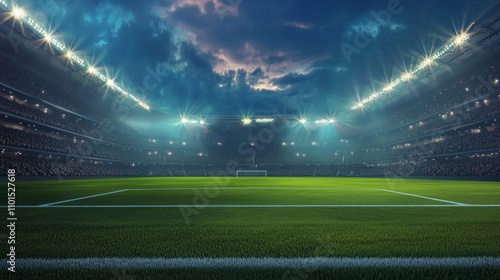 stadium buzzing excited spectators as evening descends illuminated bright floodlights. clear view showcases field ready action.
