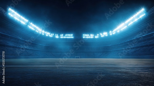 Stadium Night Lights: An empty stadium at night, illuminated by bright blue floodlights, creating a dramatic and atmospheric scene. The vastness of the stadium is emphasized.