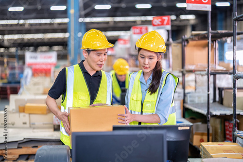 Staff working in large depot storage warehouse trainee check packing box and scan at cashier counter