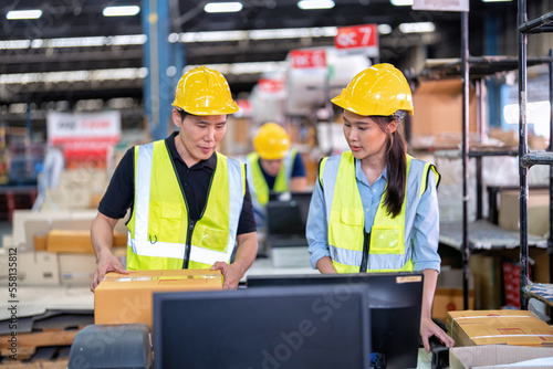 Staff working in large depot storage warehouse trainee check packing box and scan at cashier counter