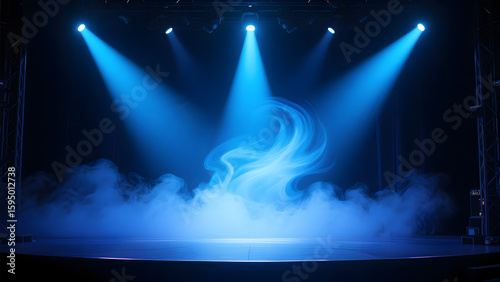 Stage with Blue Spotlights and Fog, Creating a Dramatic Atmosphere