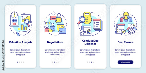 Stages of merger onboarding mobile app screen. Business consolidation walkthrough 4 steps editable graphic instructions with linear concepts. UI, UX, GUI template. Myriad Pro-Bold, Regular fonts used