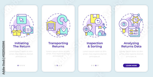 Stages of reverse logistics onboarding mobile app screen. Walkthrough 4 steps editable graphic instructions with linear concepts. UI, UX, GUI template. Montserrat SemiBold, Regular fonts used