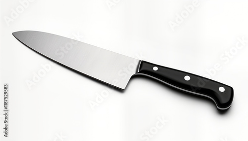 Stainless steel chef knife with black handle isolated on white background. Pro kitchen tool for cooking. Sharp blade, comfortable grip. Versatile utensil for food preparation. Ideal for butchers,