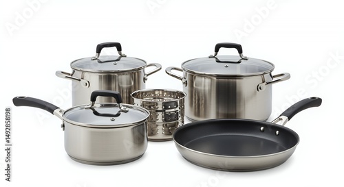 Stainless Steel Cookware Set Featuring Stockpot Steamer Saucepan and Frying Pan with Black Handles Isolated on a White Background