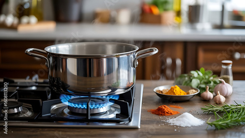 Stainless Steel Pot on Stove with Blue Flame and Spices in Kitchen Setting