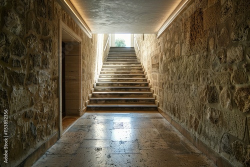 Stairway inside an old stone building leading up to a door with bright sunlight
