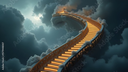 Stairway to Heaven A Golden Staircase Leading Through Fluffy Clouds Towards a Bright Light