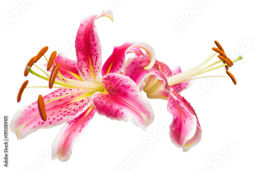 Stamen and pistil. Beautiful bouquet of pink lily flower isolated on white background. Form of a starfish. Flat lay, top view