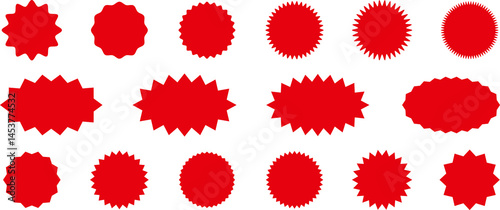 Starburst red sticker set - collection of special offer sale oval and round shaped sunburst labels and badges. Red starburst, sunburst, stamp, seal, label or burst, badge, sticker.