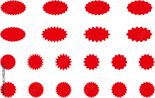 Starburst red sticker set - collection of special offer sale round and oval sunburst labels and buttons isolated on white background. Promo stickers with star edges. Vector