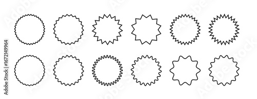 Starburst sticker set. Collection of line art sunburst badges, deal tags, price tag or quality seal with wavy edge. Flat design vector elemens.