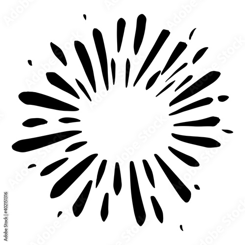 Starburst, sunburst hand drawn. Design Element Fireworks Black Rays. Comic explosion effect. Radiating, radial lines.
