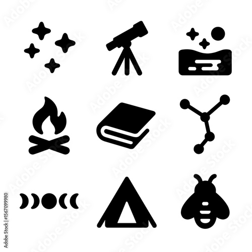 Stargazing Icon Set. Solid, filled icon set of stargazing by shore: star cluster, telescope on tripod, night sky reflection,