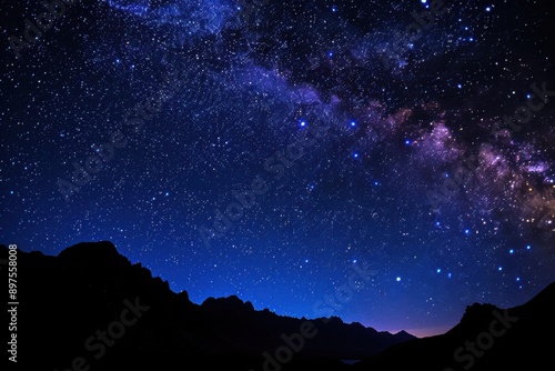 Starry sky, Milky Way, night view of the desert with distant mountains in silhouette