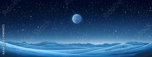 Starry sky, moonlight shining on the snowy ground, flat illustration style, simple background, cartoon style, vector graphics