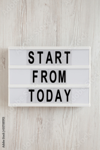 'Start from today' words on a modern board on a white wooden background, top view. Overhead, from above, flat lay.