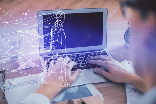 Start up drawings with businessman working on computer on background. Teamwork concept. Double exposure.