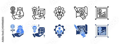 Startup Business icon set, with Funding, Product market fit, Co-founder, Prototype, Scaling.