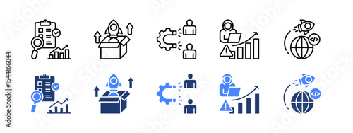 Startup Business icon set, with Market research, Product launch, Customer acquisition, Growth hacking, Accelerator.