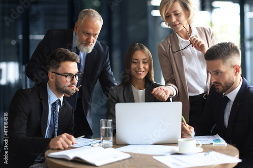 Startup business team on meeting in modern bright office interior and working on laptop.