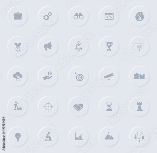startup gray vector icons on round rubber buttons. startup icon set for web, mobile apps, ui design and promo business polygraphy