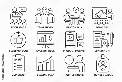 Startup icons set featuring pitch stage, team photo, and product mockup
