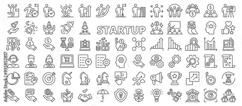 Startup icons set, in line design. Entrepreneurship, Innovation, Business growth, New venture, Startup culture, Tech startup on white background vector. Startup editable stroke icons.