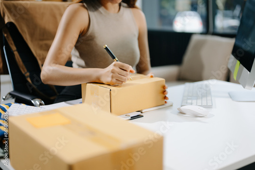Startup small business SME, Entrepreneur owner woman using smartphone or tablet taking receive and checking online