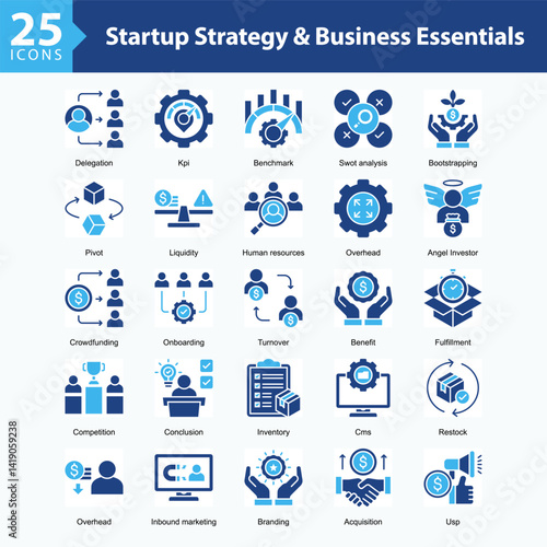 Startup Strategy & Business Essentials is a collection of icons in sheet format representing key elements of startup management, from funding and branding to growth strategies.