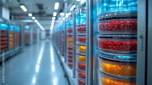 State of the art cold storage system displays vibrant perishable products arranged in clear containers, ensuring efficient inventory management for pharmaceuticals and food items.