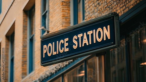 STATION Close-up of a police station sign mounted on the building's facade. Police station building