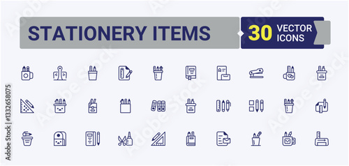 Stationery items icons. Pack of file folder, office supplies, school, paper, pencil, document, file, office, office stationery. Stationery icon set. Expanded stroke. Outline and solid pictogram.