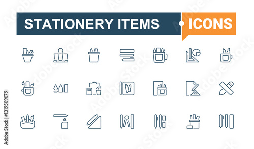 Stationery items minimal icon set. Contains related to ruler, pen, scissor, board and more. Stationery modern icons set. Collection for mobile and web apps. Minimal icon pack.
