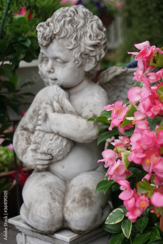 Statue of a cupid, angel holding a doll in a flowered garden 2