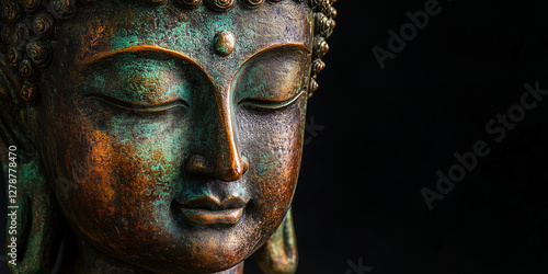 Statue of Buddha with Vibrant Green and Brown Colors Illuminated by Studio Lighting