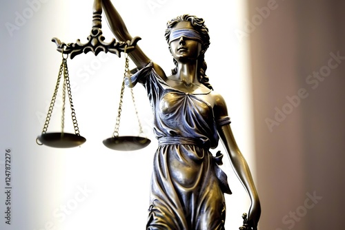 Statue of justice Goddess Themis on blurred background. Symbol of law. With copy space.
