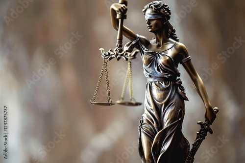 Statue of justice Goddess Themis on blurred background. Symbol of law. With copy space.
