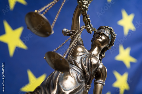 Statue of the blindfolded goddess of justice Themis or Justitia, against an European flag, as a legal concept