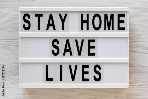 'Stay Home Save Lives' words on a lightbox on a white wooden surface, top view. Overhead, from above, flat lay.